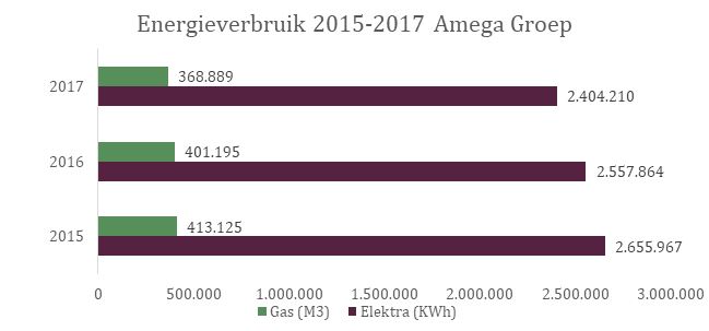 Wij hebben ons ten doel gesteld in 2012 om 10% van ons energieverbruik te reduceren in 2020 (t.o.v. 2015). In onze nieuwe strategie willen we 49% reduceren in 2030. Over 2017 hebben we ons elektriciteitsverbruik verlaagd met 10% en ons gasverbruik met 11%. We hebben ons doel voor 2020 al behaald, maar gaan de komende periode de verbeterpunten uit de Erkend Duurzaam Plus certificering oppakken. Elke vestiging beschikt over een energieambassadeur die op zijn locatie energiebesparende maatregelen doorvoert.