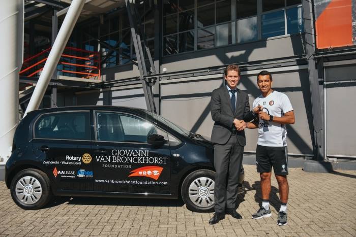 Op de foto links overhandigt manager Ames Volkswagen, Reinier de Koning, de Volkswagen up! aan Feyenoorder en oprichter van de stichting Giovanni van Bronckhorst.
